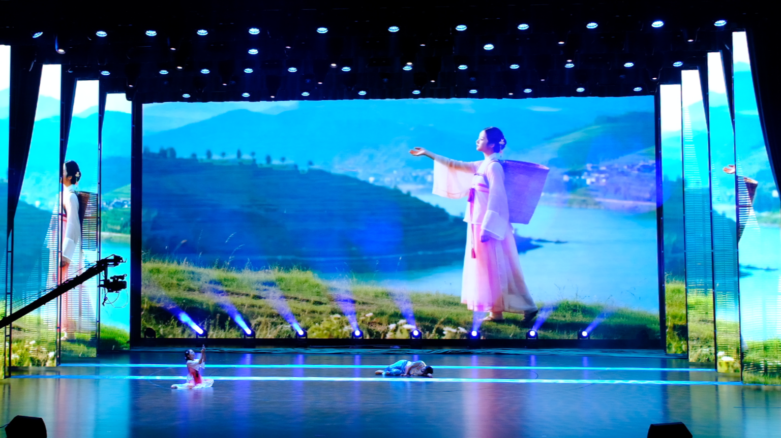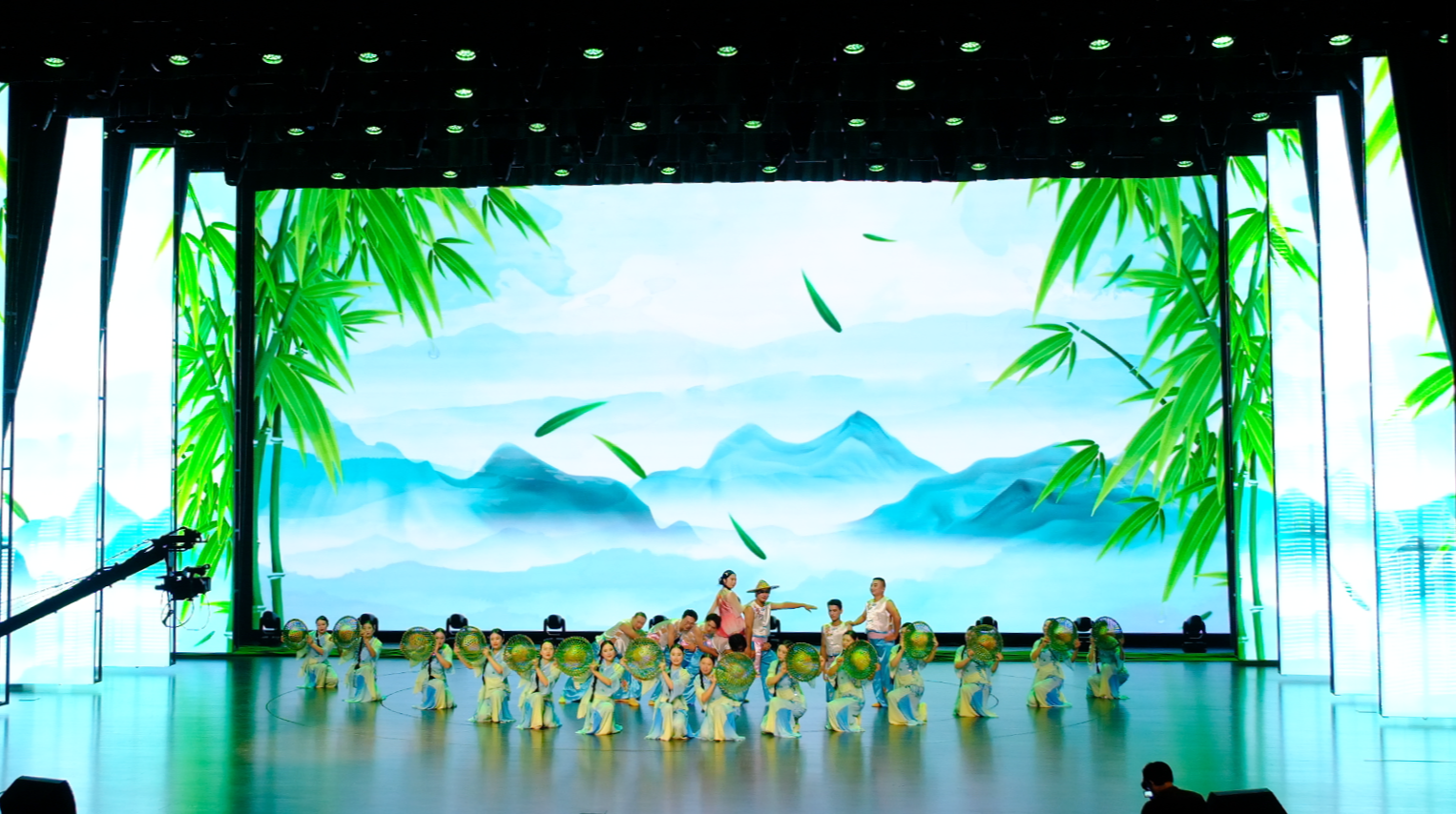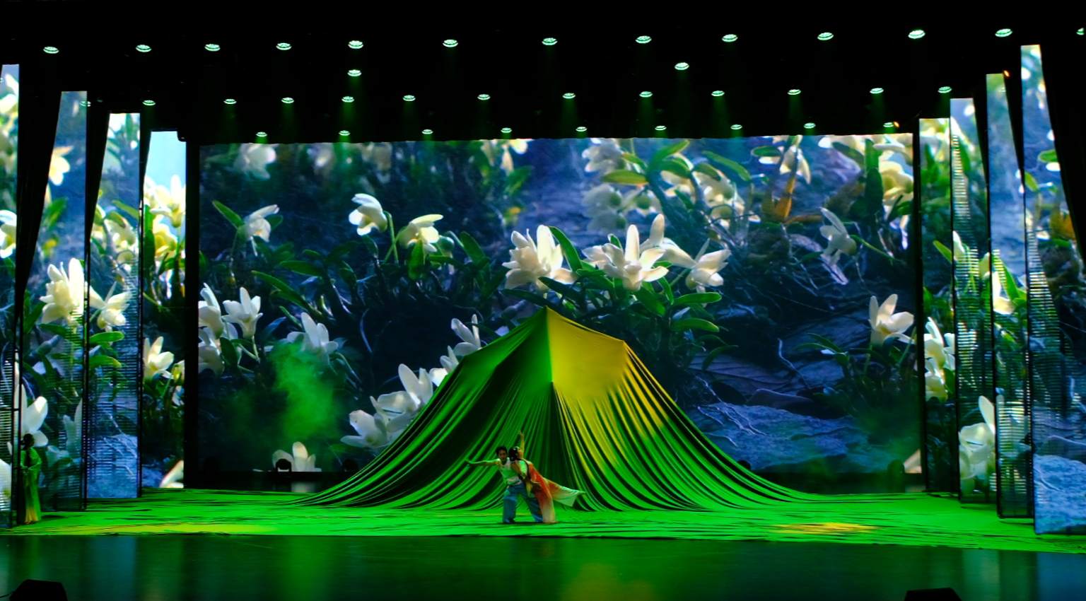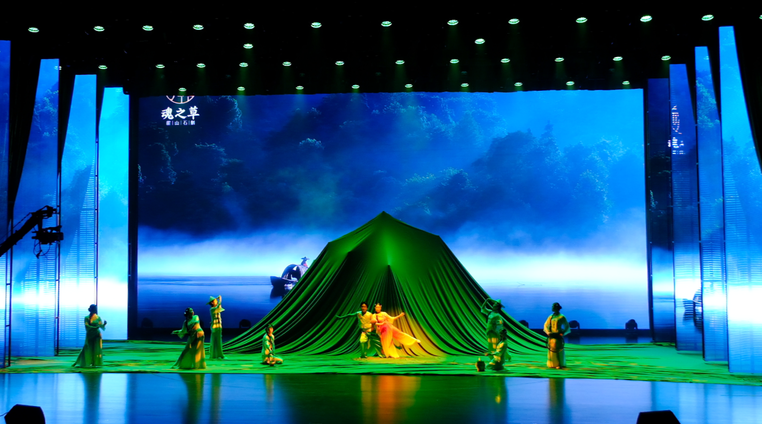 大幕拉开,光影与肢体共叙跨越时空的"仙草奇缘"。追光灯与纱幕投影交织出悬崖、瀑布、石斛林的壮阔,水声民乐烘托沉浸氛围。