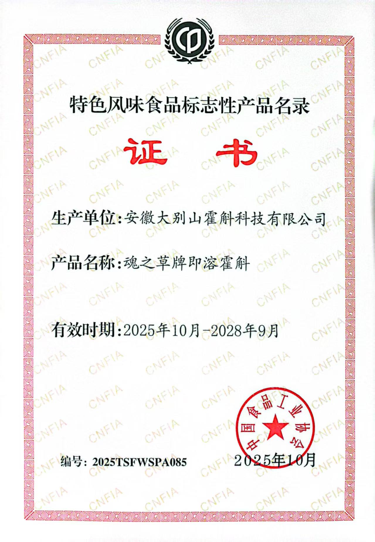 11月12日,由中国食品工业协会与泰州市人民政府共同举办的“全国特色风味食品产业高质量发展大会暨泰州健康食品产业推介会”在江苏兴化隆重召开。会上,安徽大别山霍斛科技有限公司“魂之草即溶霍斛”成功入选第二批“2025中国特色风味食品标志性产品名录”。